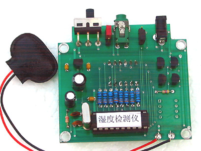 仪器按原理图装配完毕,CF01的引脚尽可能短,以减小测量误差。程序调试无误后写入IC01。温度检测仪无需调试即可工作;湿度检测计需调试工作点,业余条件下可自行创造一封闭环境进行湿度标定,在25℃环境温度下加湿,用高精度水银套管干湿球计测量湿度值,使环境相对湿度在90%处时稳定一段时间,用数字频率计测量IC02的3脚,调整W01值使输出频率为5870HZ;再将环境相对湿度调在30%处,微调W01使输出频率为7090HZ,反复多次上述过程即可完成标定工作。