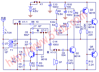 当需要讲话时,请接下“收”开关,这时,SP喇叭原本是接在输出发声的,现在变成了当作话筒来拾取音频信号了,SP的音圈随着声音的振动感应出微弱的电信号经过Q2放大,再经过经Q3推动、Q4、Q5功率放大后加到了Q1的集电集,Q1的集电极电压会随着声音的变化而变化,经过,导致了Q1的高频振荡信号幅射到空音的强弱也在随声音变化而变化,这时本机就相当于是一个小小的无线发射台了。