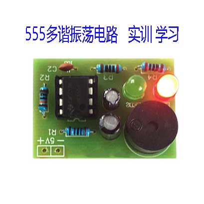 <本套件电路的核心部件是555集成定时器,它工作于无稳态工作方式,接通电源后,555集成定时器的输出端第3管脚不断地输出高低电平的方波信号,高电平点亮一个LED,低电平点亮另一个LED,所以看到的就是两个红绿颜色的LED不断地交替闪烁,蜂鸣器也发出轻微的“滴答”的声音。电路是一个经典的555定时器电路,通过两个LED灯的亮熄能够直观地看到定时器输出的电平变化,也就是一个方波信号的电平变化,适合电子初学者、爱好者和学生初步学习了解555定时器的基本功能。>